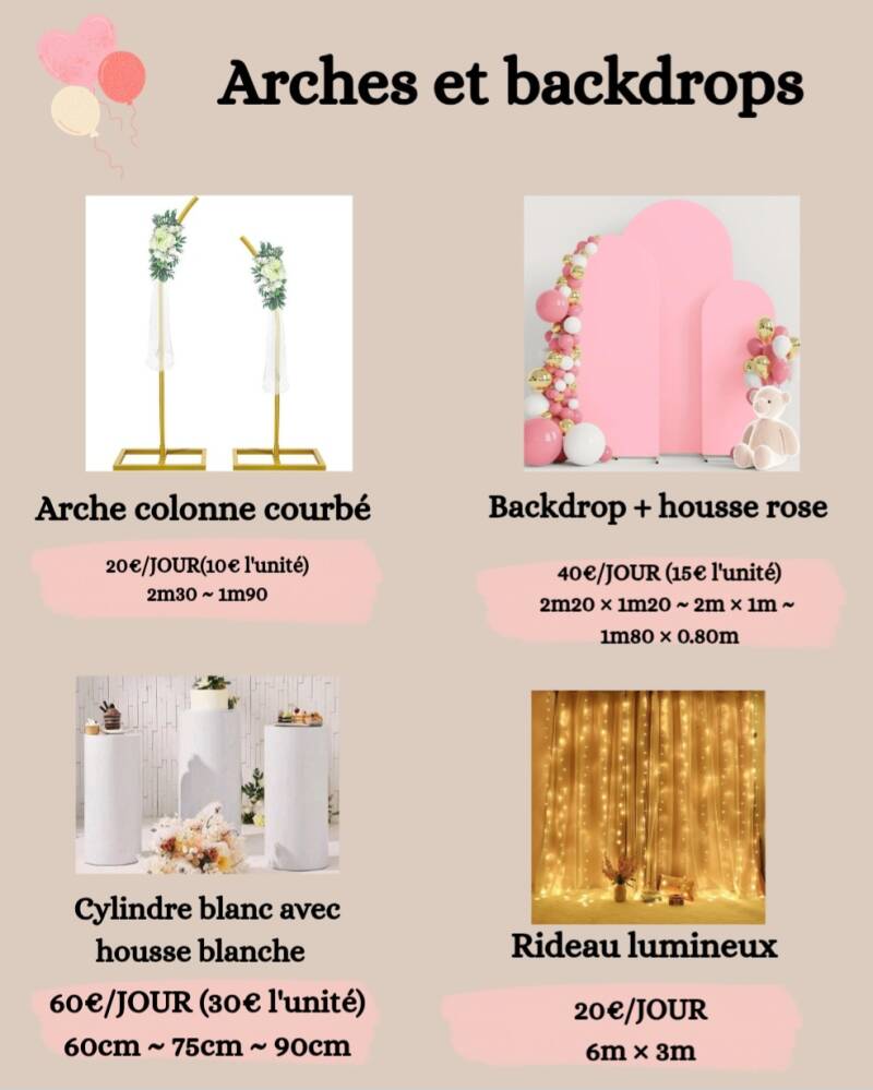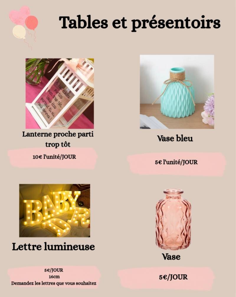 Je ferai une décoration qui correspond à votre thème et votre envie. Et faire de votre événement un véritable succès, je peux aussi faire des cadeaux personnalisés. Si vous souhaitez organiser vos événements chez vous, je vous propose de louer notre matériel à la location.